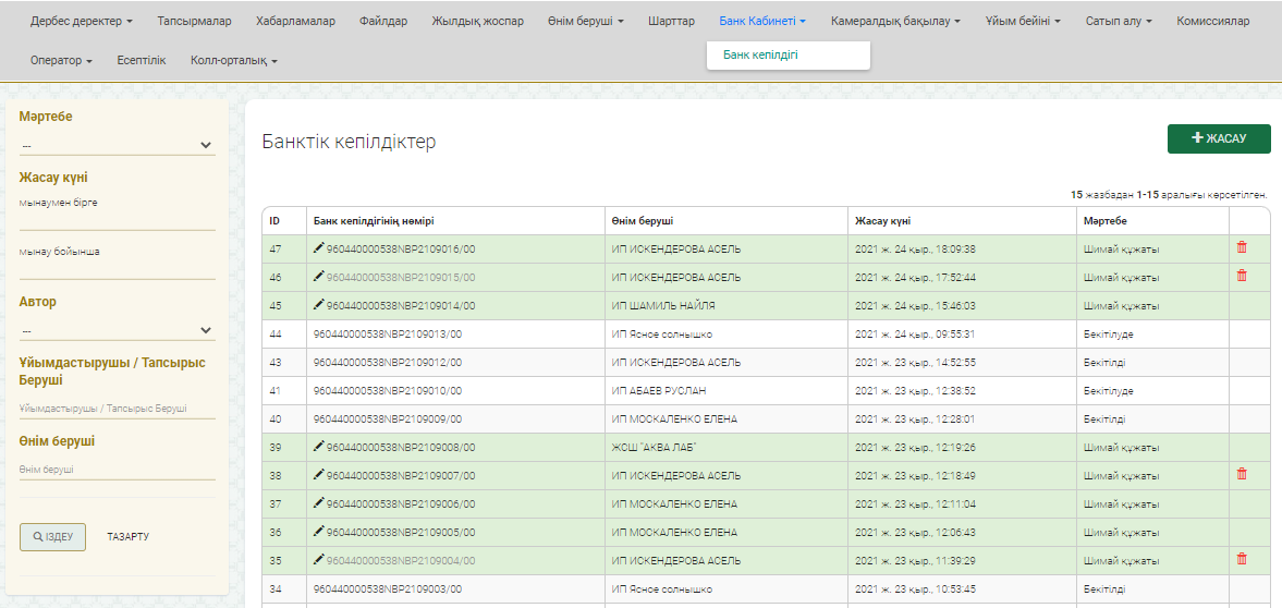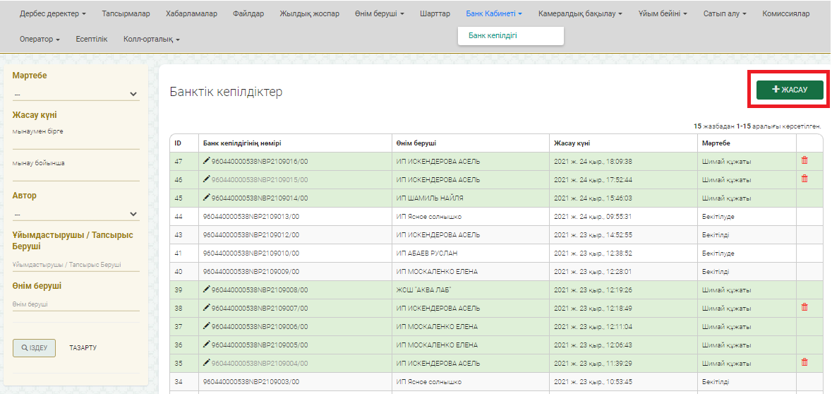Электрондық банктік кепілдікті қалыптастыру үшін «Банк кабинеті» - «Банктік кепілдік» мәзіріне кіріңіз және «Жасау» батырмасын басыңыз.