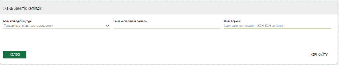 Банктік кепілдік түрін таңдаңыз, «Банктік кепілдік сомасы» жолағын және «Жеткізушінің БСН\ЖСН» жолағын толтырыңыз, «Бұдан әрі» батырмасын басыңыз.