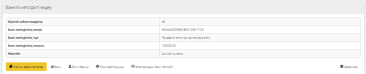 Осыдан кейін Орындаушыға жұмыс поштасына және Пайдаланушы кабинетіне электрондық банктік кепілдікті келісу немесе қол қою туралы хабарлама келеді. Орындаушы Хабарламадан сілтемеден өте отырып тура тапсырмаға келіп түседі. Немесе кепілдіктің барлық тізімін «Банк кабинеті» – «Банктік кепілдік» мәзіріне өтіп қарауға болады.