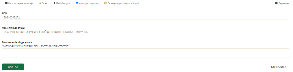 Бетбелгідегі деректерді тексеріңіз және келесі қосымша параққа өтіңіз: Жеткізуші, Ұйымдастырушы.