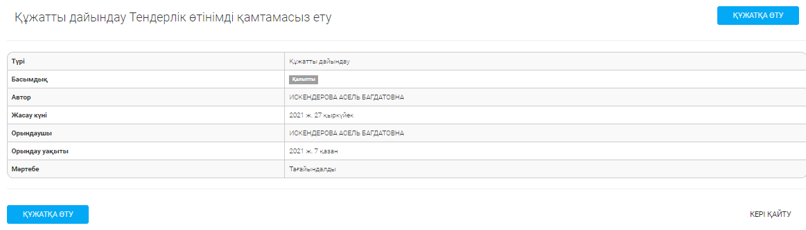 Осы бөлімдегі ақпараттың дұрыстығын тексеріңіз және«Құжатқа өту» батырмасын басыңыз.