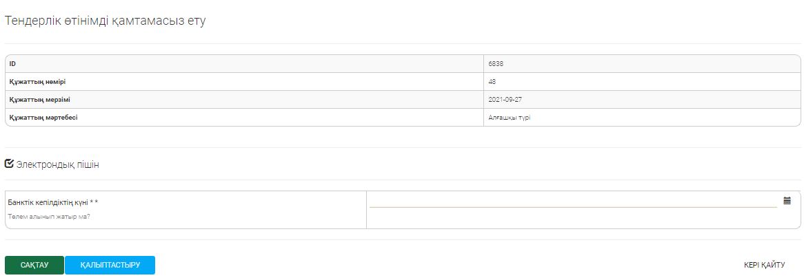 - Банктік кепілдіктің қолданылу мерзімі – Күнтізбеден күнін таңдаңыз;