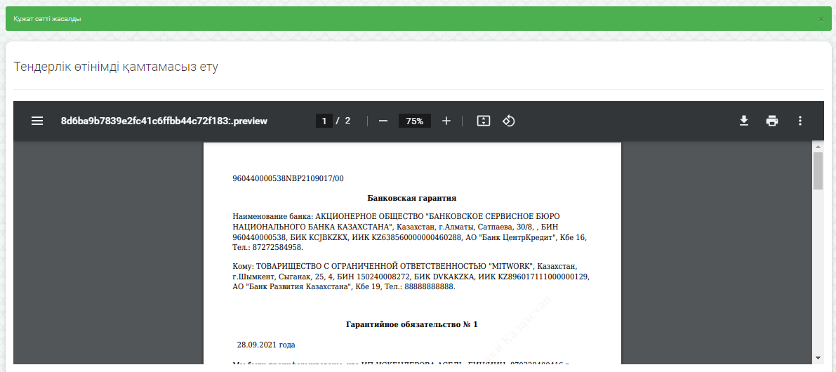 Осыдан кейін «Қалыптастыру» батырмасын басыңыз. Құжат сәтті қалыптастырылды. Сізге қалыптастырылған банктік кепілдіктің шаблоны ашылады.