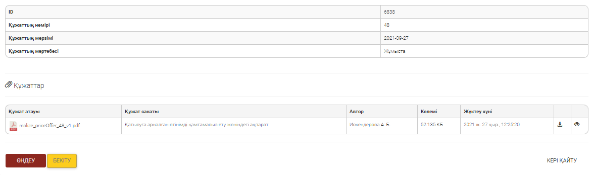 Құжатты қарауға, жүктеуге, редакциялауға немесе бекітуге болады.