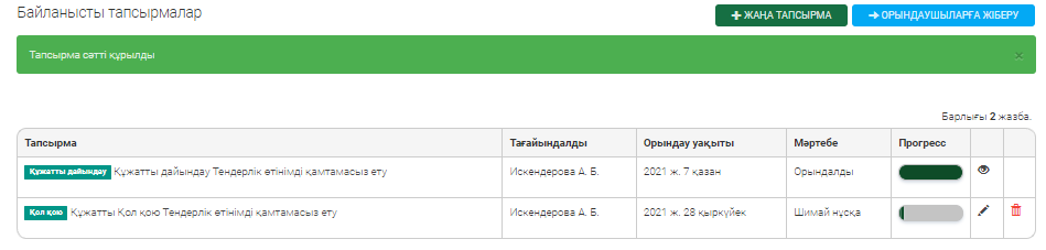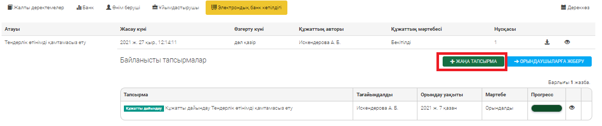 Тізімде жаңа міндет пайда болады. Электрондық банктік кепілдікті келісу және қол қою шеңберінде бірнеше міндеттерді қоюға болады. Барлық міндеттер қалыптастырылғаннан кейін «Орындаушығы жіберу» батырмасын басу қажет.