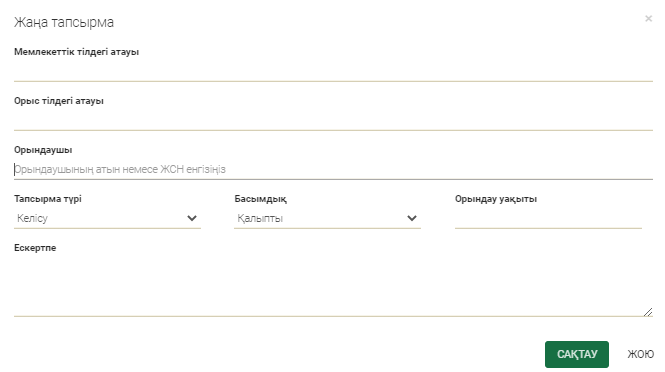 Жаңа міндеттерді жасау терезесі ашылады. Міндеттердің атауын мемлекеттік және орыс тілдерінде енгізіңіз, банк қызметкерлері тізімінен жауапты тұлғаның оның ЖСН немесе АТӘ атын енгізе отырып таңдаңыз, « Келісу» немесе «Қол қою» міндеттерінің түрін таңдаңыз, міндеттердің орындау мерзімін және артықшылығын көрсетіңіз. Сондай-ақ, Сіз ескерту қалдыра аласыз. Бұдан әрі «Сақтау» батырмасын басу қажет.