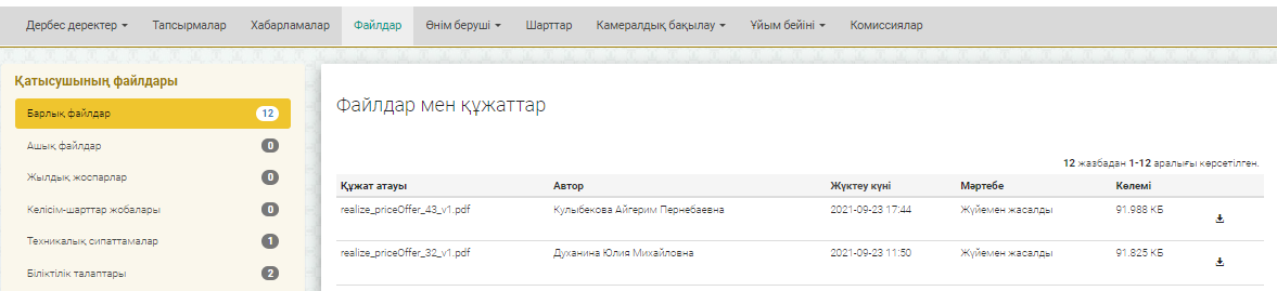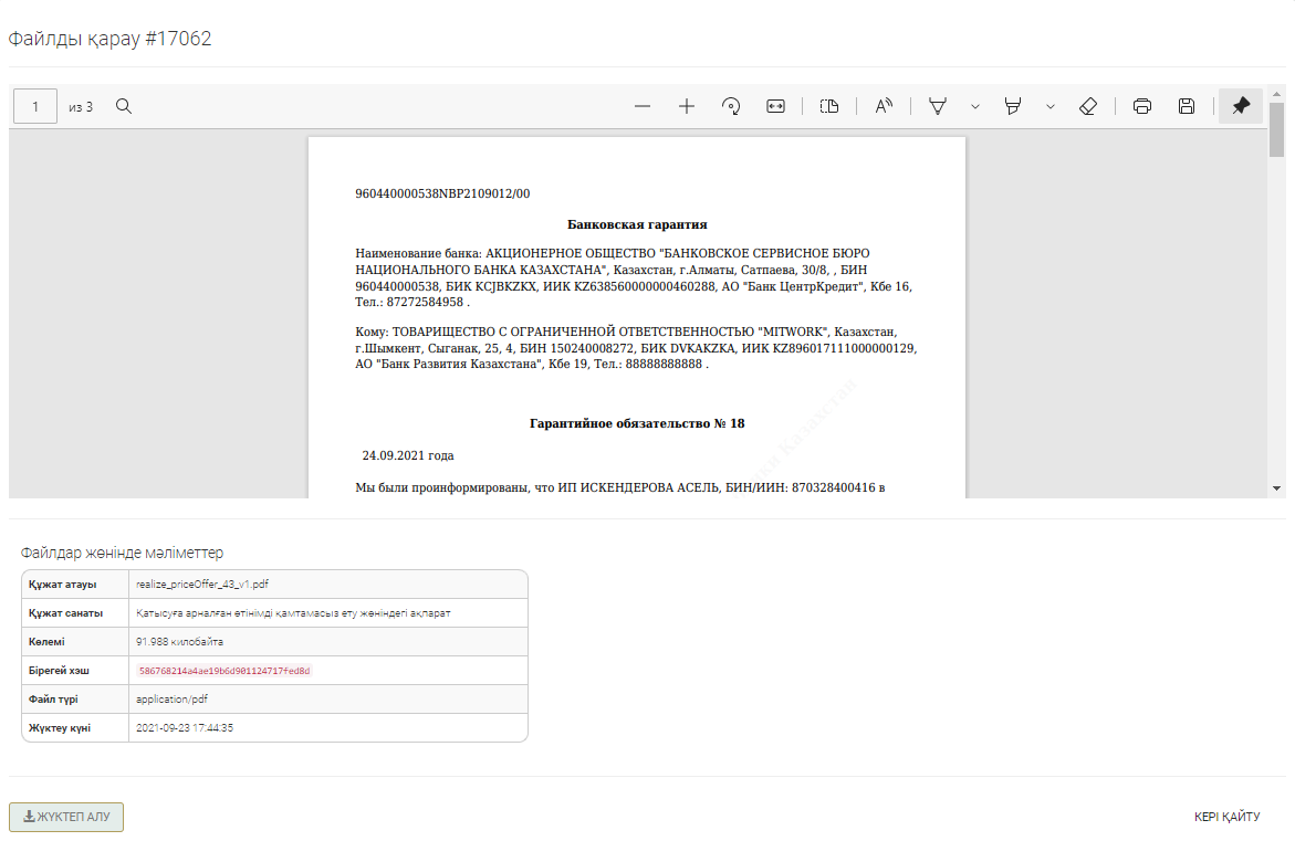 Құжатты қарауға және жүктеуге болады. Құжатты қарау үшін оның атауын басыңыз. Жүйе құжаттарды қарау режиміне қайта бағыттайды.