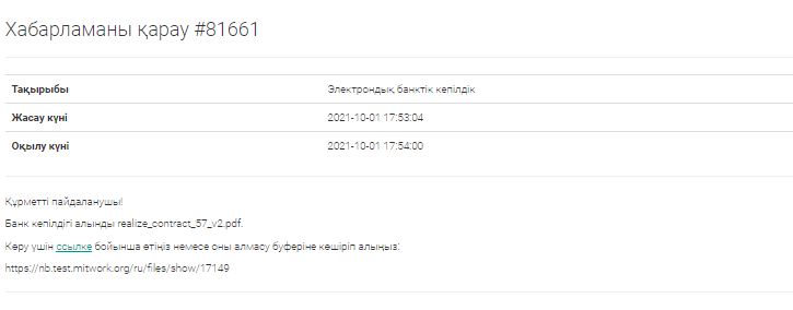 Банк қызметкері электрондық банктік кепілдікті (бұдан әрі ЭБК) қалыптастырғаннан және қол қойғаннан кейін, Жеткізушіге файлға сілтемем хабарлама келіп түседі.