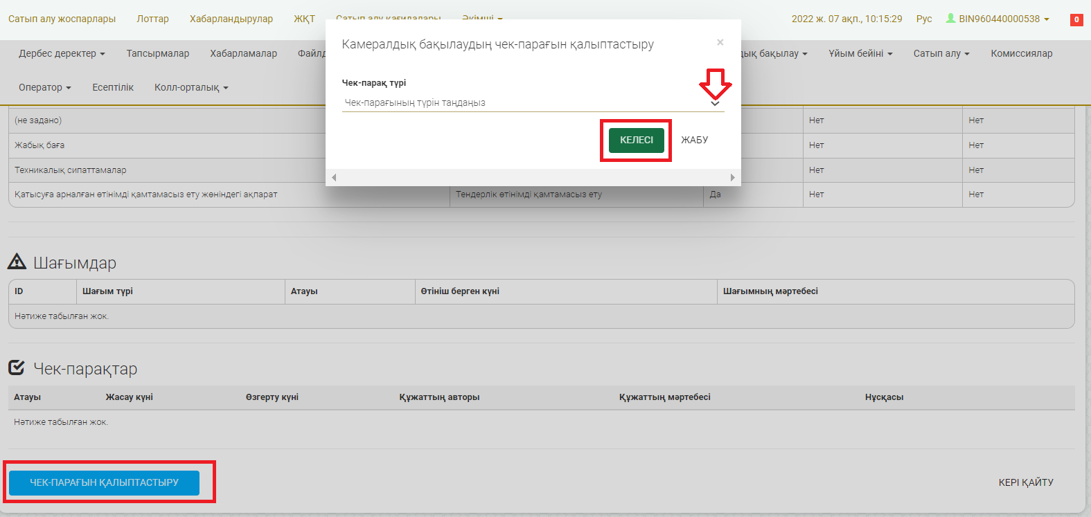 Чек-парақтарын жасау үшін, камералық бақылау рөлі бар пайдаланушыға «Камералық бақылау/сатып алулар» бөліміне өтіп, сатып алу атауын басу қажет.