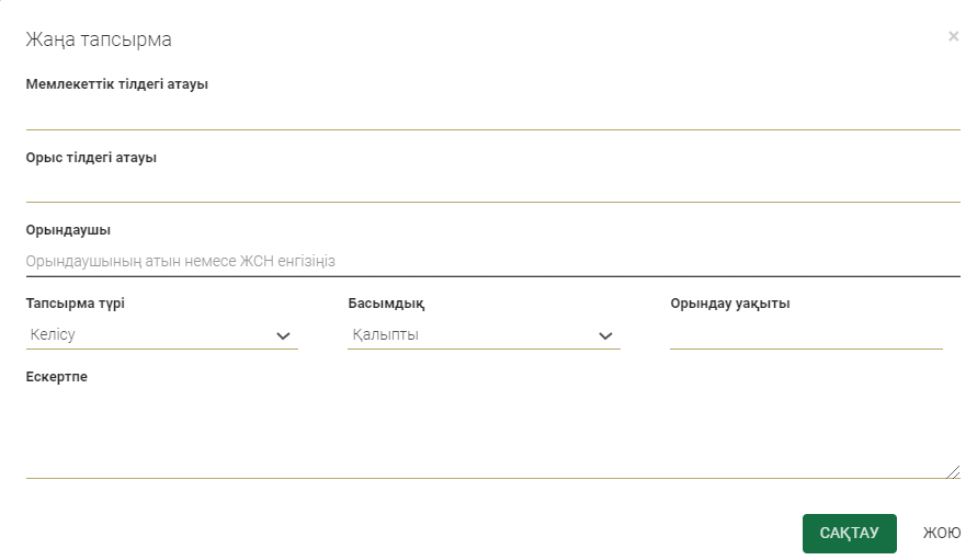 Сіз тапсырманы құруға арналған форманы көресіз, онда қажетті жолақтарды толтыру, сондай-ақ тапсырма түрін таңдау қажет. Бұдан әрі «Сақтау» батырмасын басыңыз.