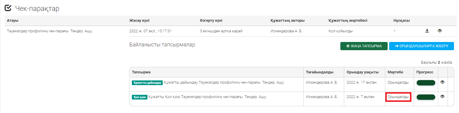 Құжатты бекіткеннен кейін, құжаттың статусы «Бекітілді» статусына ауысады. Бұдан әрі Сізге «Жаңа тапсырмалар» батырмасын басып, жаңа тапсырмаларды құру қажет.
