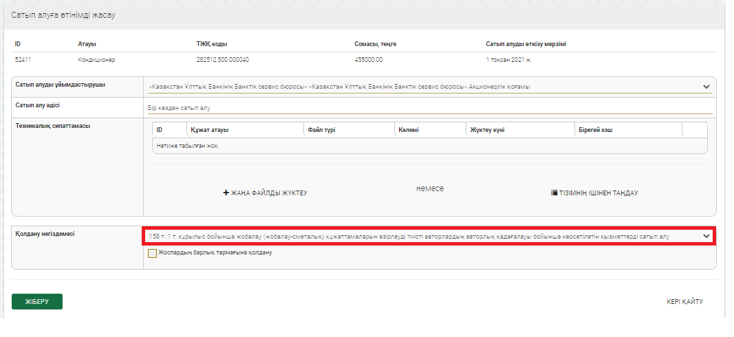 Бұдан әрі сатып алу тәсілін қолдану негіздемесін таңдап, өтінімді жасаңыз және «Жіберуді» басыңыз.