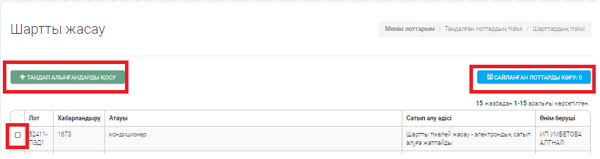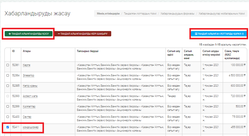 Сатып алуды белгілеу, таңдалғанға қосу және «Таңдалған лоттарды қарау» батырмасын басу қажет.