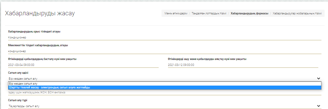 Назар аударыңыз! «Өтінімді қабылдауды бастау күні және уақыты» және «Өтінімді ашу және қабылдауды аяқтау күні және уақыты» бөлімінде порталдан тыс (қағаз тасымалдағышта) өткізілген сатып алуға сәйкес күнін және уақытын көрсетеміз.