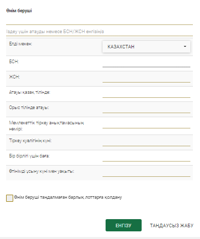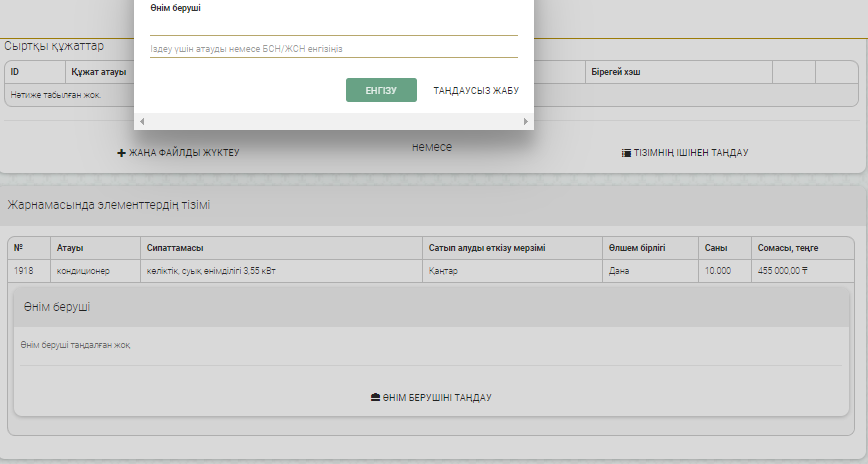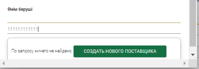 Жеткізушіні таңдаймыз (егер жеткізуші жүйеде тіркелген болса, тіркелген портал мүшелерінің тізімінен таңдауға немесе ол болмаған жағдайда тиісті нысанды толтыруға болады).