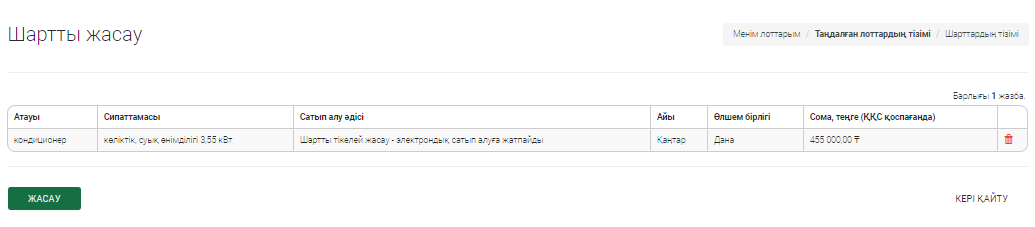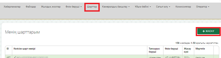 Сатып алудың циклін толық аяқтау үшін, шарттың карточкасын жасау қажет, бұл үшін «Шарттар» мәзірінде «Жасау» батырмасын басамыз.