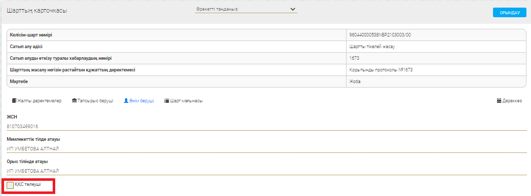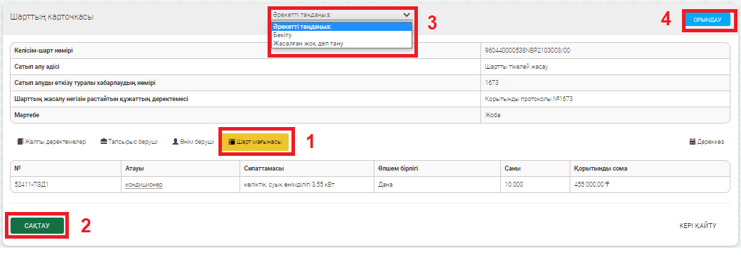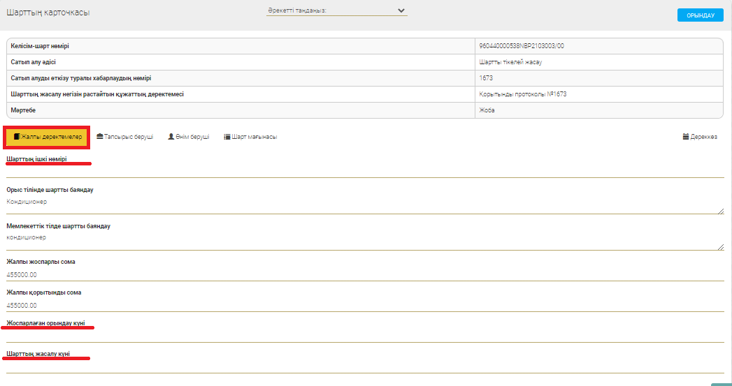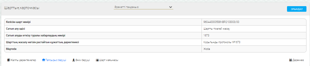 «Шарттың мәні» бөлімі жүйеде автоматты түрде жасалады, сатып алудың атауын басу арқылы шарттың мәні туралы ақпараттарды қарау мүмкіндігі бар. Шарттың мәнін қарағаннан кейін «Сақтауды» басамыз. Осыдан кейін «Іс-әрекеттерді таңдау» мәзірінен шартты бекіту қажет және аяқтау үшін «Орындау» батырмасын басыңыз.