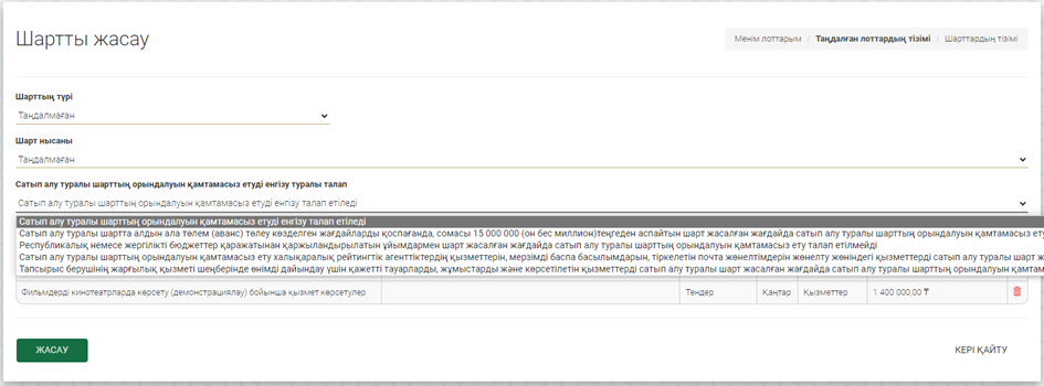 Егер Тапсырыс беруші шарттың орындалуын қамтамасыз етуді немесе тендерлік өтінімді қамтамасыз етуді қайтармаған жағдайда «Шарттар» бетінде анықтама көрсетіледі
