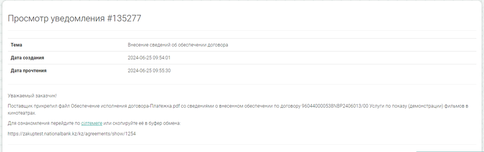 бұдан әрі Портал енгізілген шарттың орындалуын қамтамасыз ету туралы шарт авторына хабарлама жібереді