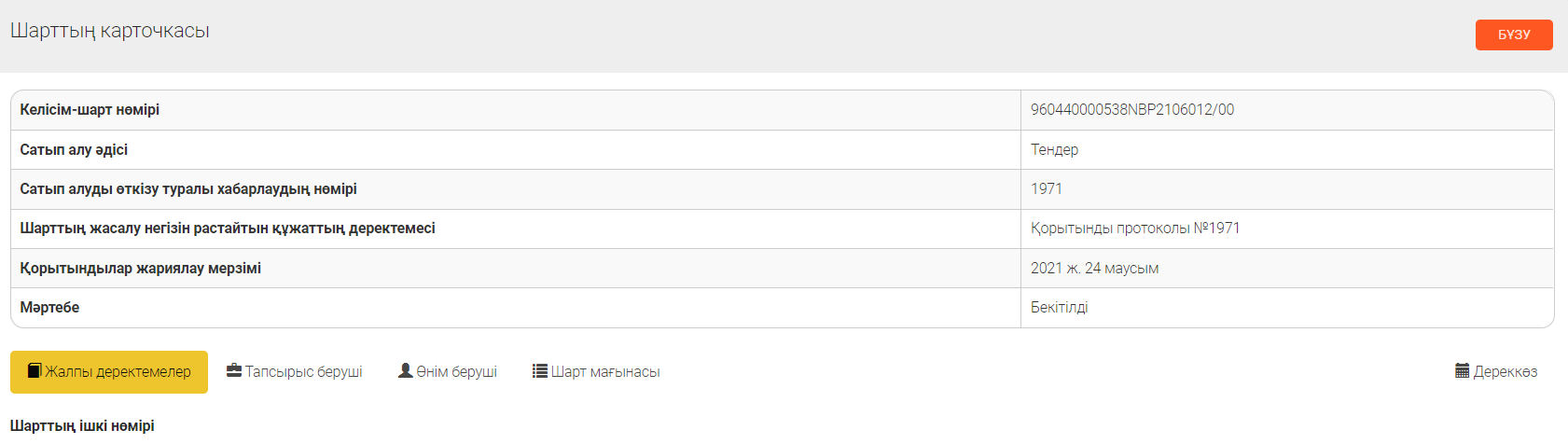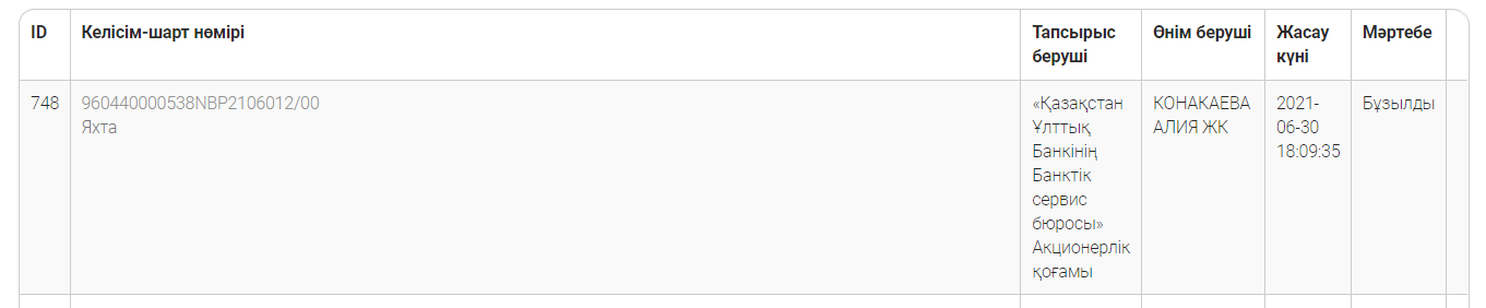 «Менің шарттарым» бөлімінде «Бұзу» статусы бар шарт көрсетіледі.