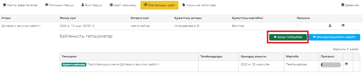 Шартты Жеткізушіге келісуге жіберу үшін «Электрондық шарт « қосымша парақшасында «Жаңа тапсырма» жасау керек.