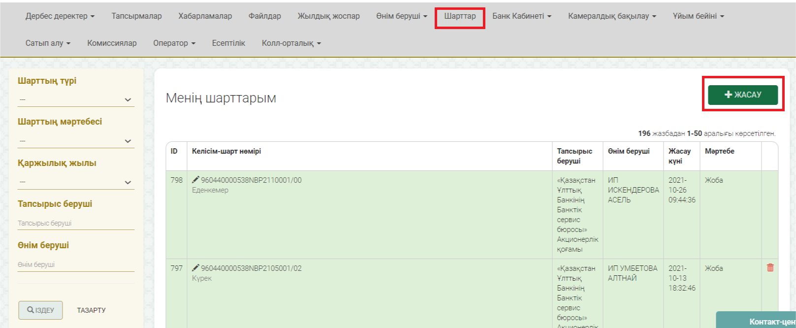 Шарт жасау үшін «Шарттар» мәзірін таңдау қажет және ашылған формадан «Менің шарттарым» «Жасау» батырмасын басу қажет.