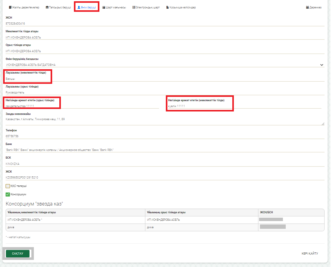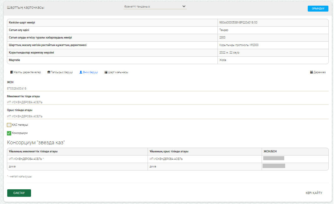- Егер жеткізуші консорциум болып табылса, онда консорциум туралы деректерді жүйе автоматы түрде толтырады.