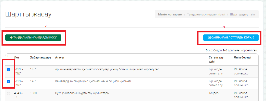 Көрсетілген формада шарт жасау талап етілетін лоттарды таңдау қажет. Бұдан әрі «Таңдап алынғанды қосу» батырмасын басу қажет және оң жағында «Таңдап алынған лоттарды қарау» батырмасын бассаңыз таңдап алынған өтінімдердің саны көрсетіледі.