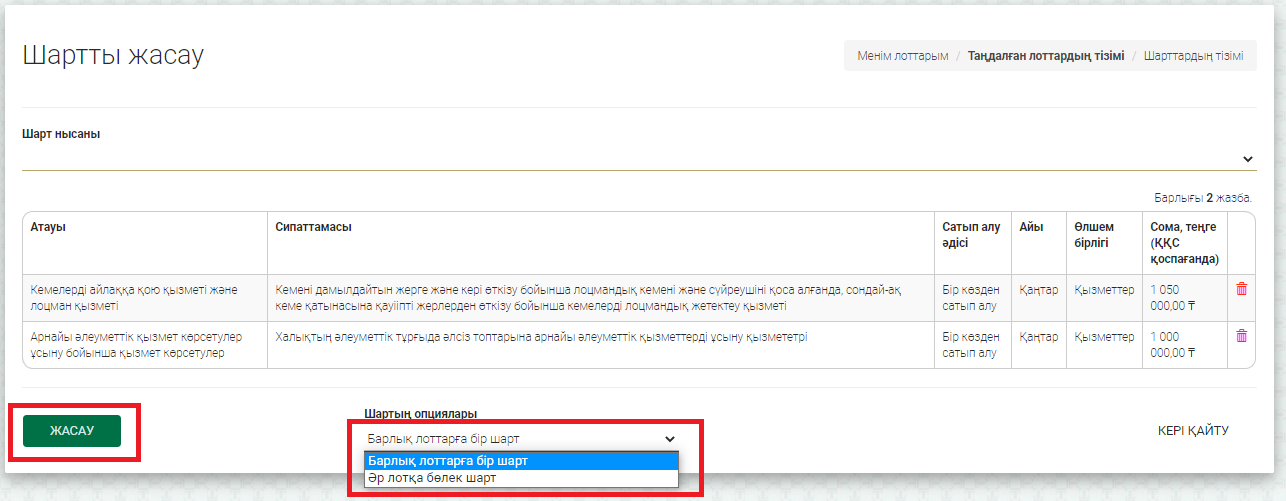 Барлық лоттар үшін бір шарт «Барлық лоттар үшін бір шарт» немесе «Әрбір лотқа жеке шарт» әрбір лотқа жеке шарт жасау мүмкіндігі бар. Бұдан әрі «Жасау» батырмасын басыңыз.