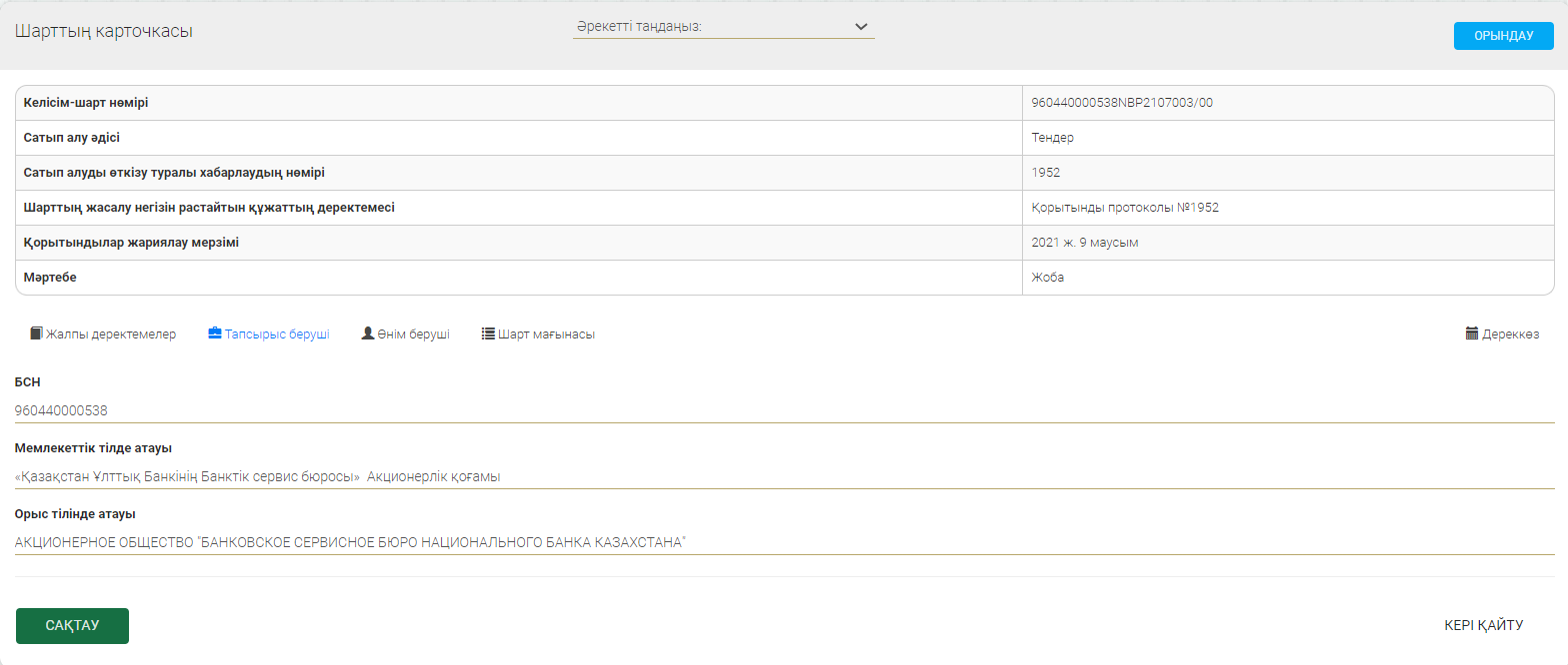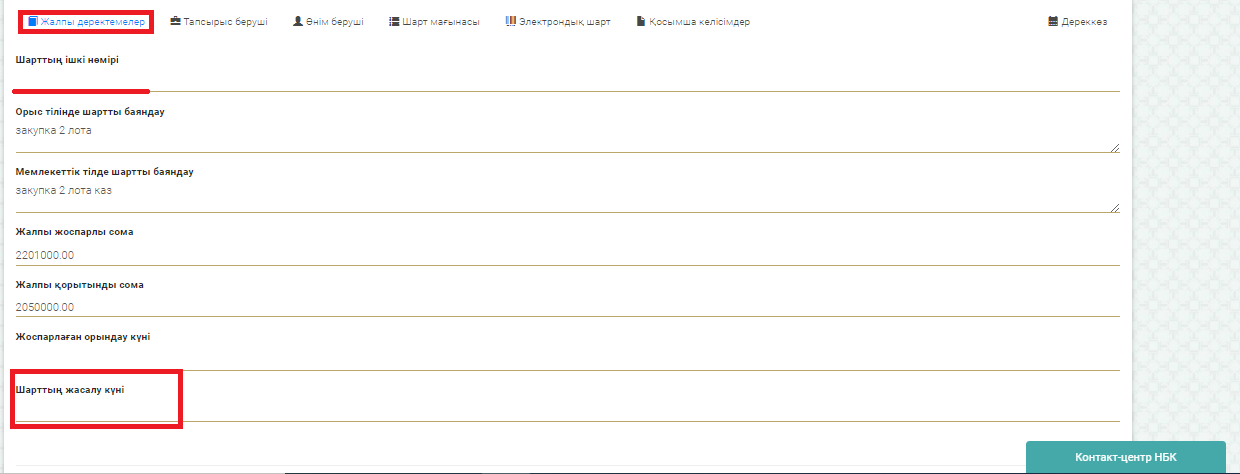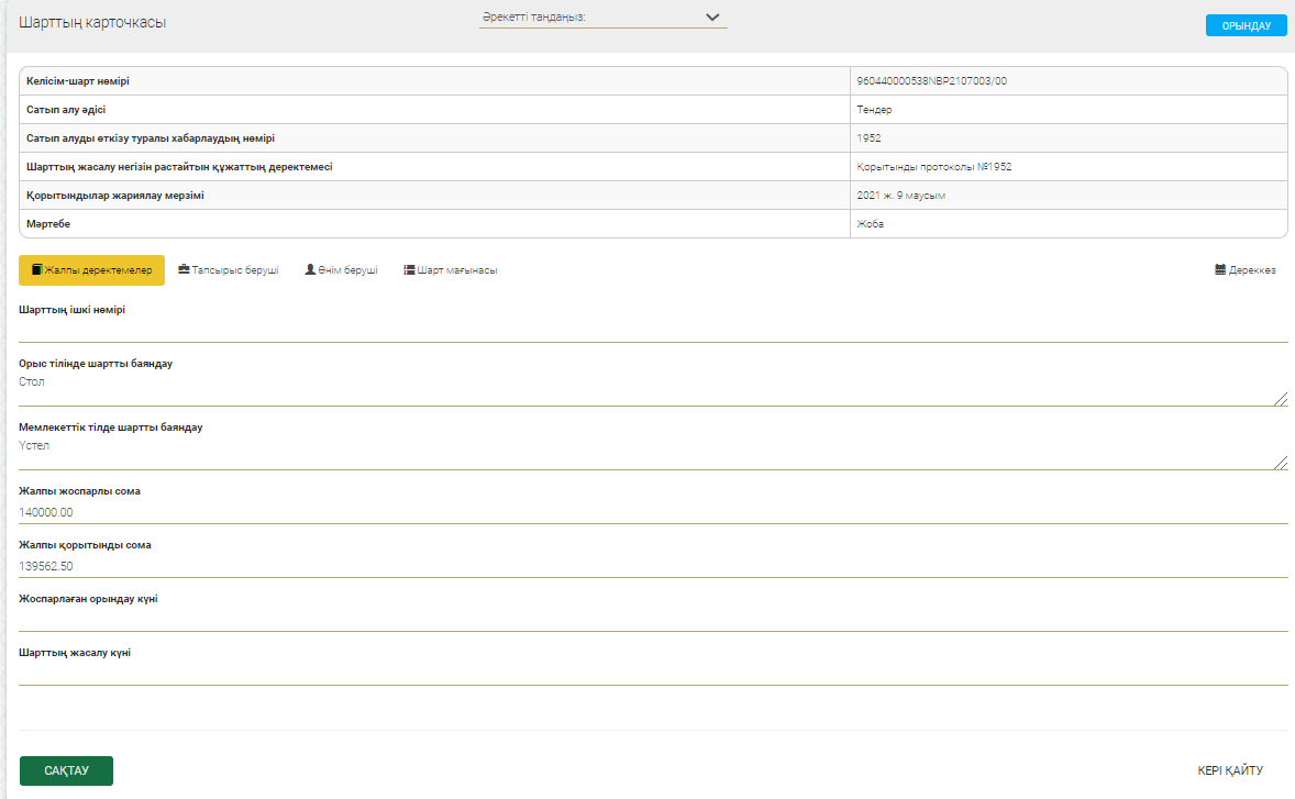 «Қарандаш» батырмасын басқан кезде, шарт бойынша ақпаратты толтыру қажет болатын, шарттың карточкасын қарау формасы көрсетіледі: