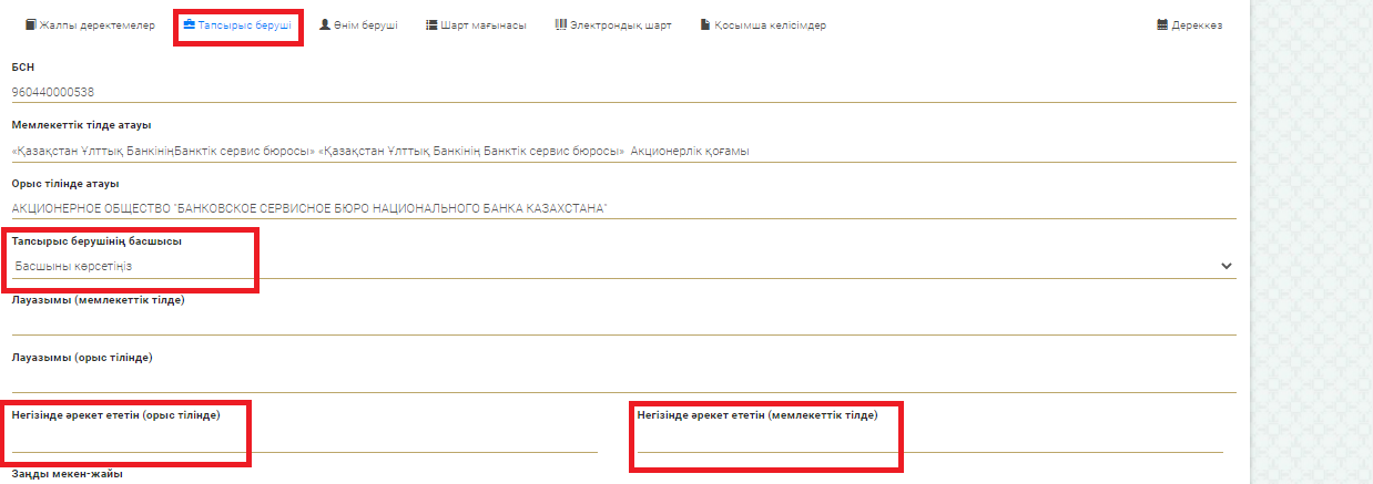 - «Тапсырыс беруші басшысы» жолағында тізімнен түсіп қалған пайдаланушыны таңдау қажет (басшылардың лаузымдары болмаған жағдайда «Ұйым профилі" - "Қызметкерлер» мәзірін толтыру қажет).