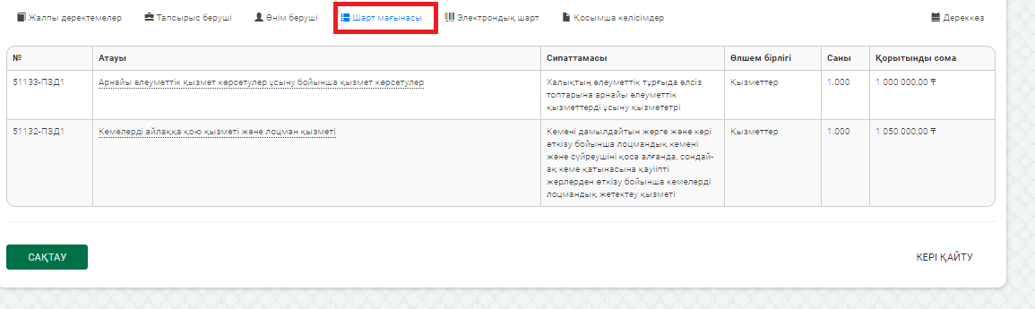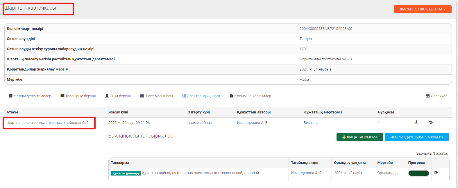 Назар аударыңыз!!! Шарттың электрондық нұсқасын қолданбай сатып алу кезінде шартты толтыру талап етілмейді (шарттың карточкасын қалыптастыру жеткілікті).