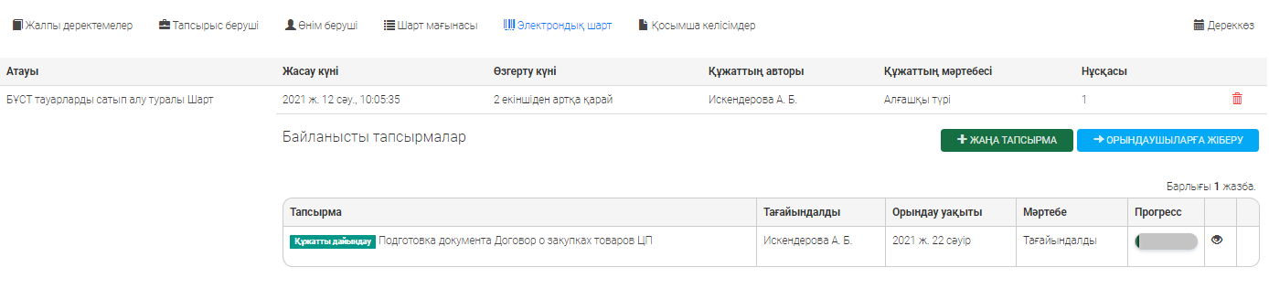 Шартты қалыптастыру үшін, «Электрондық шарт» қосымша парағына өту керек, бұдан әрі деректерді толтыру үшін «Шарттың атауына»өту керек