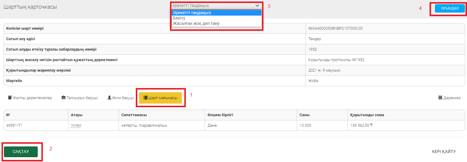 «Шарттың мәні» бөлімі сатып алу атауын басқан кезде жүйеде автоматты түрде құралады, мұнда шарттың мәні туралы ақпаратты көруге болады. Шарттың мәнін қарағаннан кейін, «Сақтау» батырмасын басыңыз. Содан кейін, «Іс-әрекеттерді таңдау» мәзірінде шартты бекіту қажет және аяқтау үшін «Орындау» батырмасын басыңыз.