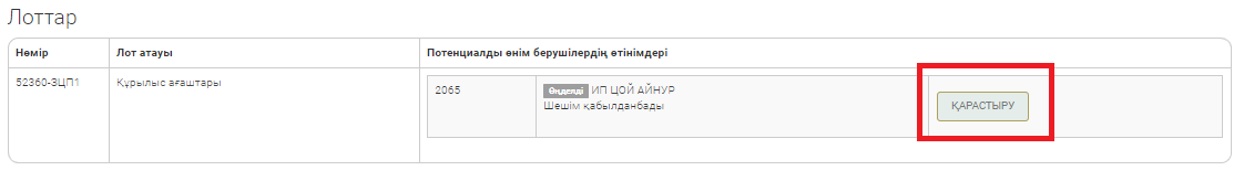 Пайда болған терезеде Лоттар категориясында әлеуетті жеткізушінің өтінімдері көрсетіледі, оны қарау үшін «Қарастыру» батырмасын басыңыз.