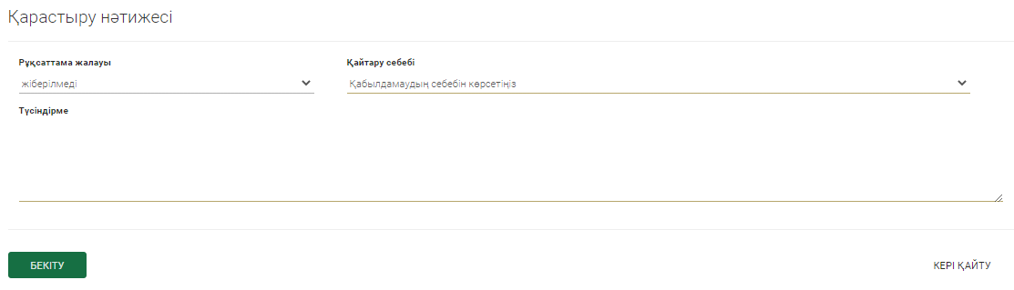 Өтінімнен бас тартылған кезде, міндетті түрде бас тарту себебін көрсету қажет (Тзімнен таңдау)