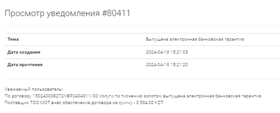 Файл жүктелгеннен кейін Портал «Шартты қамтамасыз ету туралы мәліметтерді енгізу» туралы хабарламаны Шарттың авторына жібереді