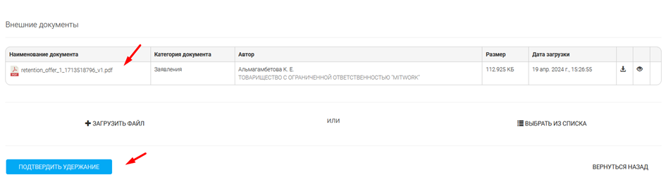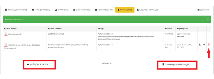 Шарт карточкасында жеткізушіде төлем тапсырмасы немесе банк кепілдігі түрінде қамтамасыз етуді енгізген жағдайда «Файлды жүктеу» батырмасын басу арқылы сыртқы құжатты жүктеу мүмкіндігі