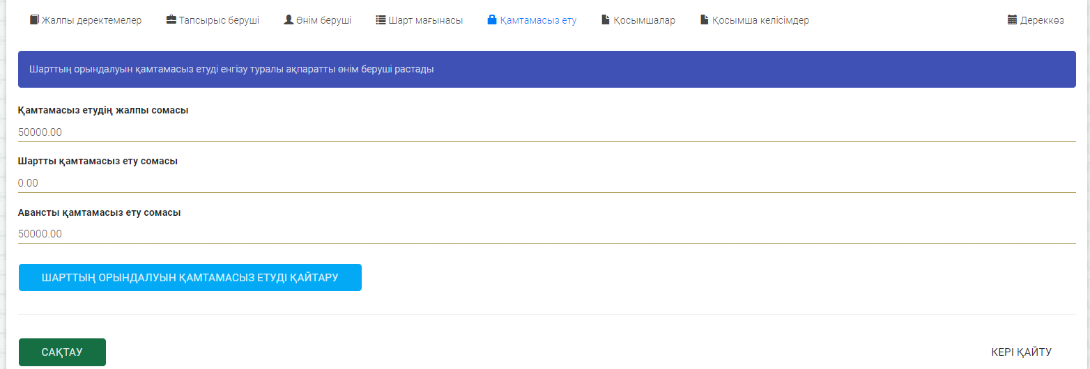 Егер жеткізуші шарттың орындалуын қамтамасыз етуді электрондық әмиян түрінде енгізген жағдайда, онда «Бекітілген»/«Шарт бұзылған» мәртебесі бар Шарттың карточкасында «Шарттың орындалуын қамтамасыз етуді қайтару» батырмасы көрсетіледі