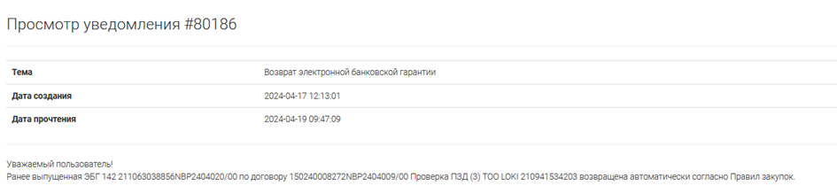 Егер Шарттың орындалуын қамтамасыз ету электрондық банк кепілдігі болған жағдайда, қайтару кезінде Портал Банктің қызметкеріне хабарлама жібереді, сондай-ақ электрондық банк кепілдігінің мәртебесі «Қайтарылды» болып өзгереді