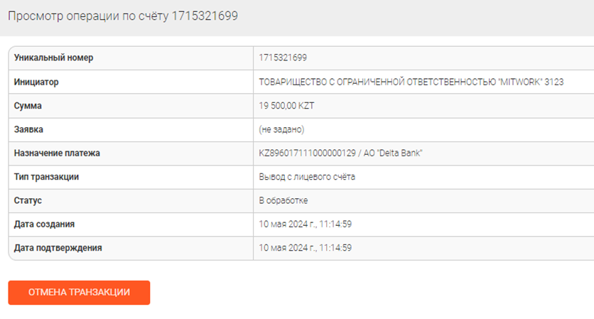 Транзакцияны болдырмау үшін Тапсырыс беруші «Өңдеуде» мәртебесімен транзакцияны ашуы керек. Транзакция картасында Портал модальды терезеде растау мүмкіндігі бар «Транзакцияны болдырмау» батырмасын көрсетеді.