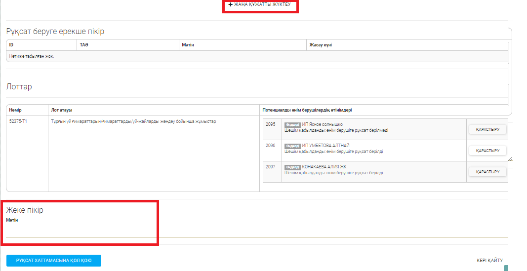Назар аударыңыз!!! «Алдын ала рұқсат беру хаттамасына / Рұқсат беру хаттамасына қол қою» батырмасын басқаннан кейін қолданыстағы «Алдын ала рұқсат беру хаттамасында /Рұқсат беру хаттамасында» ерекше пікірдің мәтіндік шешімін өзгертуге болмайды. Ерекше пікірдің мәтіндік шешіміне өзгерістер енгізу тек хаттаманы тендерлік комиссияның хатшысы қайта жасаған жағдайда ғана мүмкін болады.