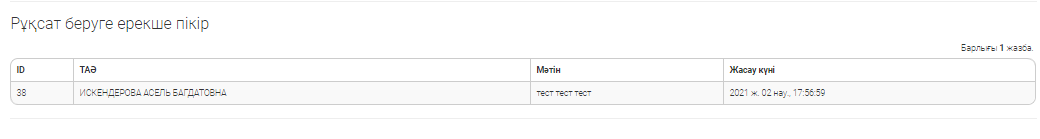 «Ерекше пікірді» қалыптастырған кезде және «Алдын ала рұқсат беру хаттамасына қол қою»/«Рұқсат беру хаттамасына қол қою» батырмасын басқан кезде, ерекше пікірдің енгізілген мәтіндік шешімі тендерлік комиссияның барлық мүшелеріне және комиссияның хатшысына комиссия мәзірінде көрсетіледі.