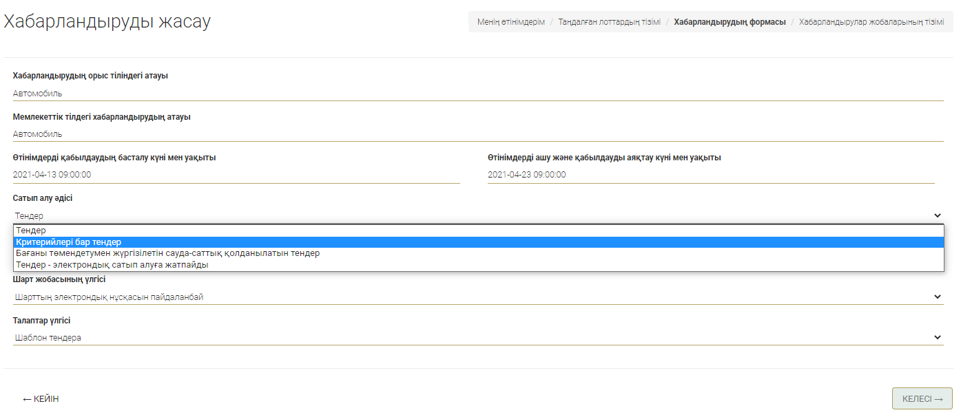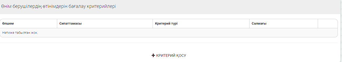 Хабарландыруды құру формасына «Жеткізушілердің өтінімдерін бағалау критериилерін» қосу керек. Өлшемдерді қосу үшін «Критериилерді қосу» батырмасын басу қажет.