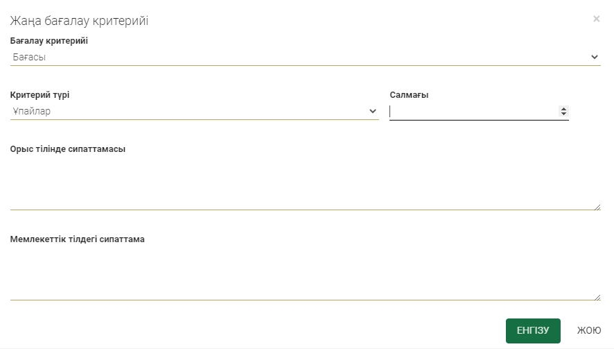 Жүйе осы критериилерді толтыруға арналған терезені көрсетеді, онда «Бағалау критериилерін» таңдап, «Салмақты» көрсету және екі тілде сипаттама беру қажет. Осыдан кейін «Қосу» батырмасын басыңыз.