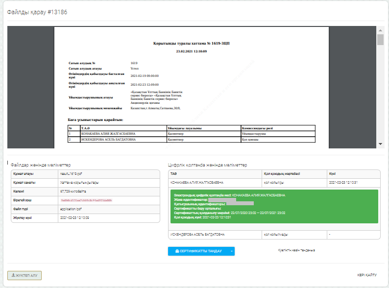 - Пайдаланушы өзінің жеке кабинетінде құжатқа қол қою қажет екендігі туралы хабарлама алады. Қол қоюға өту үшін хабарламада көрсетілген сілтеме бойынша өтіңіз. «Сандық қолтаңба туралы ақпарат» терезесі ашылады, онда құжаттарға комиссияның қол қою мәртебесімен қол қоюы және «Сертификатты таңдау» батырмасы көрсетіледі. Файлға қол қойылғаннан кейін қол қою терезесінің орнына ЭЦҚ туралы мәліметтер көрсетіледі