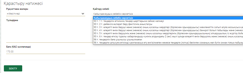 Потенциалды жеткізушінің өтінімінен бас тартқан кезде, сіз кіру жалаушасында «Қайта ұсынусыз бас тартылды» белгісін таңдап, тізімнен бас тарту себебін таңдап және қажет болған жағдайда түсініктеме қосып, содан кейін «Бекіту» батырмасын басыңыз.