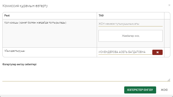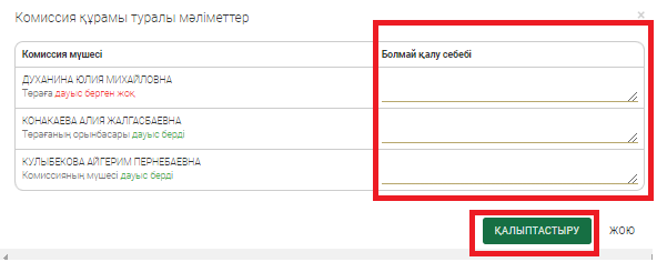 Көрсетілген «Комиссияның құрамы туралы ақпарат» терезесінде, Хатшы қажет болған жағдайда комиссия мүшелерінің «Келмеу себебі» жолағын толтырып, содан кейін «Қалыптастыру» батырмасын басу керек.