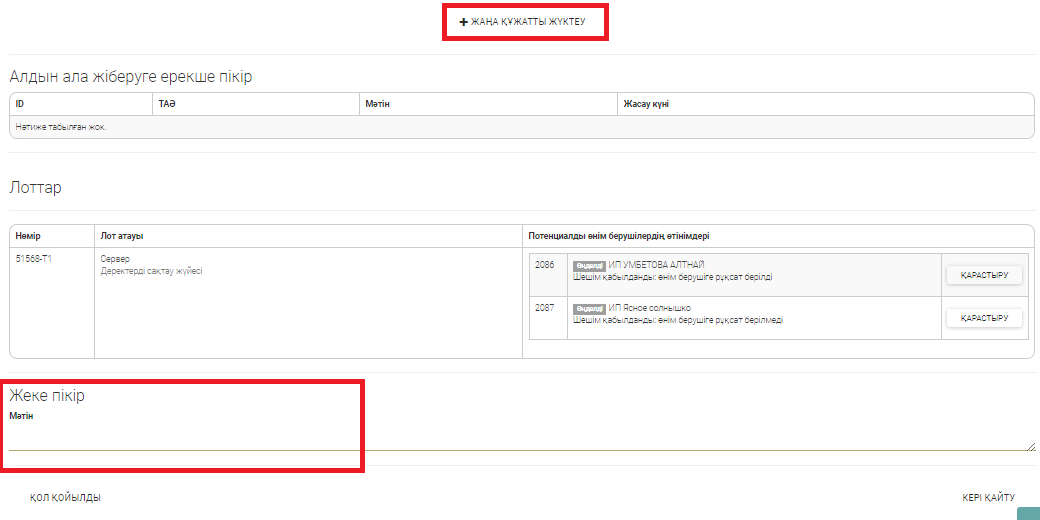 Қажет болған жағдайда тендерлік комиссияның мүшелері «Ерекше пікір» қалдырып, құжатты жүктей алады ( Ерекше пікір енгізу нұсқаулығы)