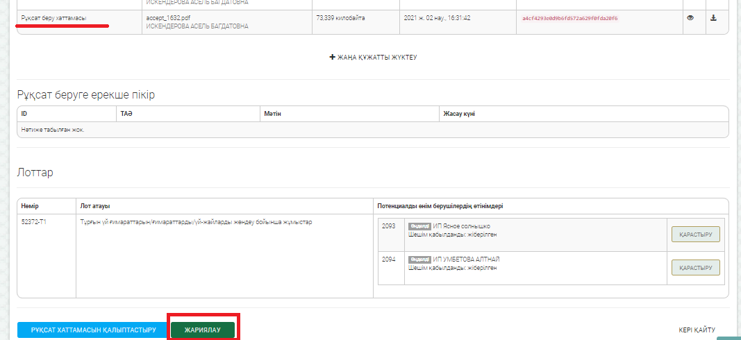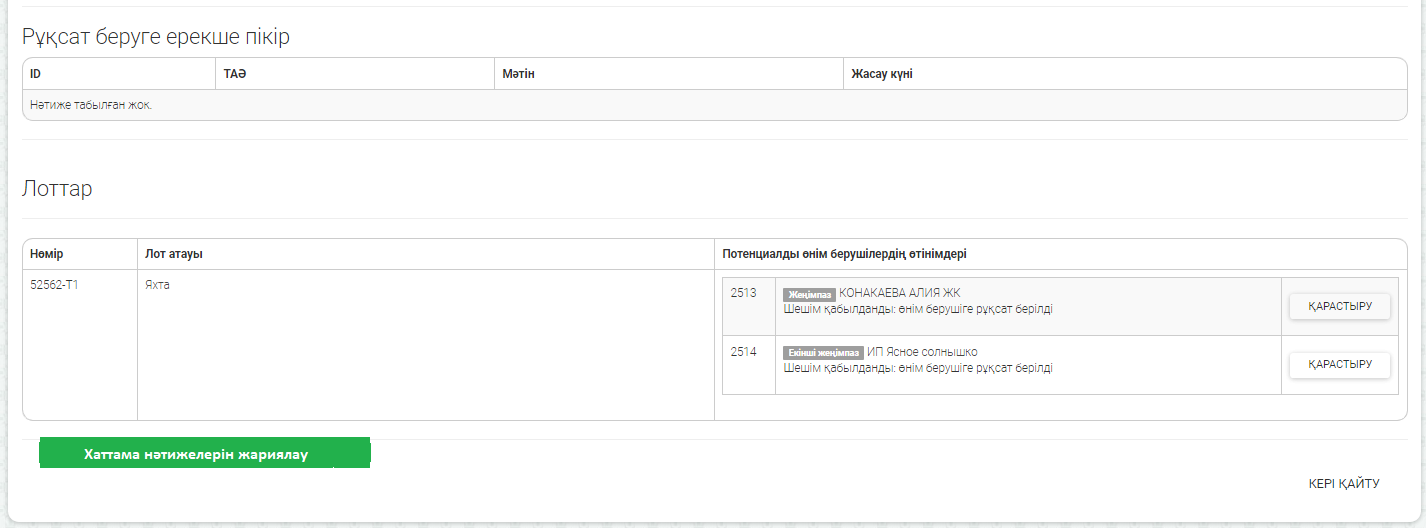- Портал хабарландыруға қатысқан әлеуетті жеткізушілерді көрсетіп, ашу хаттамасын жасайды;